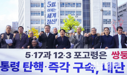 강기정 광주시장이 지난해 12월 9일 오후 동구 5.18민주광장에서 시의원, 구청장, 종교, 시민사회단체 대표 등과 쌍둥이포고령, 대통령 탄핵, 책임자 처벌 촉구를 위한 성명서를 발표한 뒤 구호를 외치고 있다. 사진제공=광주시