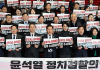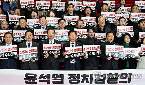 더불어민주당 정청래 대표와 김병기 원내대표를 비롯한 참석 의원들이 4일 서울 여의도 국회에서 열린 윤석열 정치검찰의 조작 기소 책임자 처벌 촉구를 위한 규탄대회에서 손팻말을 들고 구호를 외치고 있다.(연합)
