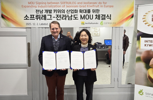전남도농업기술원(원장 김행란)은 최근 프랑스 라바듀(Labatut)에서 유럽 키위 전문기업인 소프뤼레그(Sofruileg S.A.)와 전남도 육성 키위 품종의 유럽 산업화를 위한 업무협약(MOU)을 체결하고, 신품종 다래 시험재배 계약도 동시에 맺었다고 9일 밝혔다.