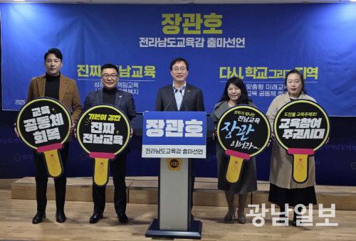 장 전 지부장은 이날 오전 11시 전남도의회에서 기자회견을 열고 “정치만 있고 교육은 없는 전남교육의 현실을 끝내고, 학교와 지역의 힘으로 전남교육을 다시 세우겠다”며 전남교육 5대 핵심 비전을 발표했다.