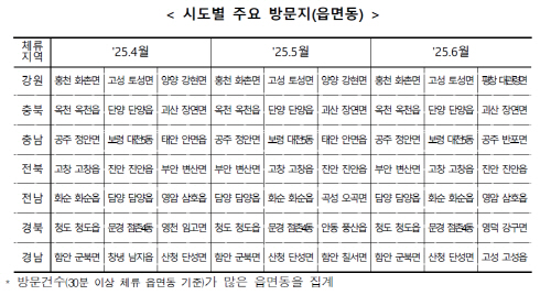 체류인구가 가장 많이 찾은 지역은 담양군 담양읍, 화순군 화순읍, 곡성군 오곡면, 영암군 삼호읍 등이었다. 외국인 체류인구(5월 기준)는 6만7000명으로 타 시·도 대비 많은 편이며, 이들의 평균 체류일수는 5.0일, 체류시간은 14.2시간으로 외국인 평균(체류일수 4.2일·체류시간 13.6시간)을 웃돌았다.