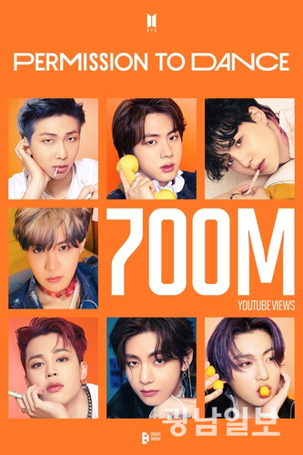 그룹 방탄소년단(BTS) ‘퍼미션 투 댄스’(Permission to Dance) 뮤직비디오가 유튜브 조회수 7억회를 넘어섰다고 소속사 빅히트 뮤직이 11일 밝혔다.
