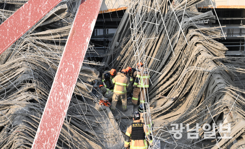 11일 오후 광주 서구 치평동 광주대표도서관 공사현장에서 철골 구조물이 붕괴돼 소방대원들이 매몰자 구조 작업을 벌이고 있다. 사고는 옥상층인 2층 콘크리트 타설 과정에서 건물이 붕괴 됐으며 소방당국은 관할 소방서 인력 전원을 동원하는 대응 1단계를 발령하고 특수구조대 등을 동원해 구조 작업을 벌이고 있다.