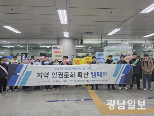 광주교통공사(사장 조익문)가 10일 서구 상무역에서 제77주년 세계인권 선언기념일(인권의 날)을 맞아 존중과 배려의 인권 문화 확산을 위한 대시민 홍보 캠페인을 펼쳤다.