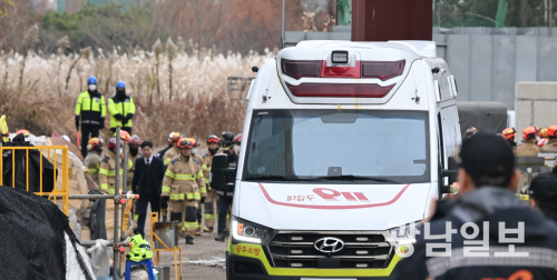 광주대표도서관 붕괴 사고 사흘째인 지난 13일 광주 서구 치평동 사고 현장에서 구급차량이 마지막 매몰자를 싣고 이동하고 있다. 이 사고로 매몰됐던 작업자 4명이 사고 발생 사흘인 지난13일 모두 수습되면서 경찰과 노동당국의 원인 규명 수사가 본격화됐다.
