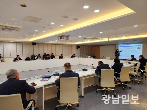 김영문 광주시문화경제부시장이 15일 오전 시청 중회의실에서 열린 복합쇼핑몰 상권영향평가 연구용역 최종 보고회에 참석해 연구용역 결과를 청취하고 있다. 사진제공=광주시
