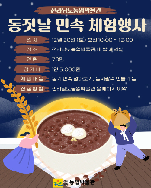 행사는 동짓날의 절기적 의미와 전통 민속을 소개하고, 동지팥죽을 만들어 보는 체험 중심 프로그램으로 구성됐다. 선착순 70명이며, 참가 신청은 전남도농업박물관 누리집(http://www.jam.go.kr)에 하면 된다. 참가비는 무료다.