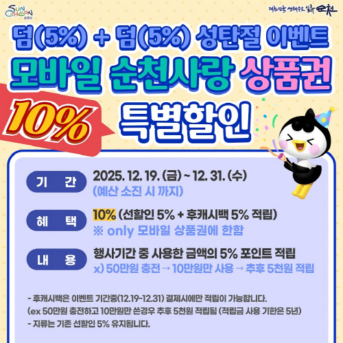 순천시가 연말 소비 진작과 지역경제 활성화를 위해 19일부터 31일까지 ‘모바일 순천사랑상품권 크리스마스 특별 할인 행사’를 진행한다.