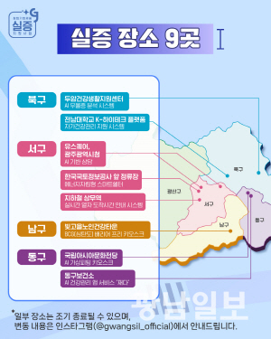 서구에서는 △유스퀘어와 광주시청(㈜헬프티처의 AI기반 상담) △한국국토정보공사 앞 정류장(㈜레플러스의 에너지자립형 스마트쉘터) △지하철 상무역(㈜에스유아이씨티의 실시간 열차 도착시간 안내시스템) 등서 체험이 가능하다.