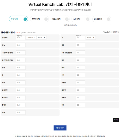 세계김치연구소 연구팀은 이러한 수요에 대응해 연구소가 장기간 축적해 온 김치자원은행의 원·부재료 정보 데이터와 농림축산식품부의 김치산업 실태조사, 식품의약품안전처의 식품영양성분 데이터베이스를 통합해 배합비 기반 AI 시뮬레이션 시스템을 구축했다.