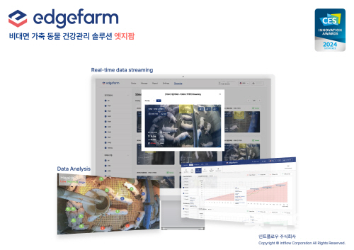 인트플로우가 보유한 핵심 플랫폼은 비대면 가축 건강관리 AI 솔루션 ‘엣지팜(EdgeFarm)’으로, 개체 수, 체중, 식사량, 활동량 등 데이터를 24시간 기록·모니터링하고 분석된 데이터를 바탕으로 위축돈 알림, 생산성 향상에 필요한 정보를 PC, 휴대전화로 손쉽게 확인할 수 있다.