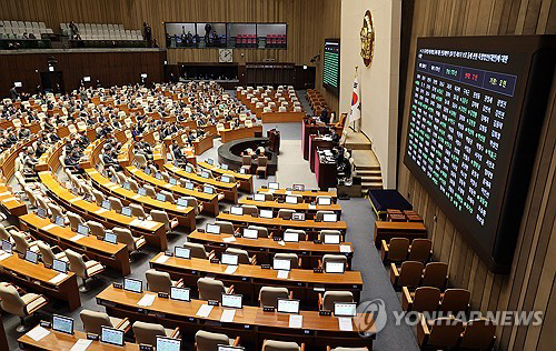 23일 국회에서 열린 12월 임시국회 본회의에서 12·3 윤석열 비상계엄 등에 대한 전담재판부 설치 및 제보자 보호 등에 관한 특별법이 무제한 토론 끝에 통과되고 있다. 이날 표결에 국민의힘은 불참했다.(연합)