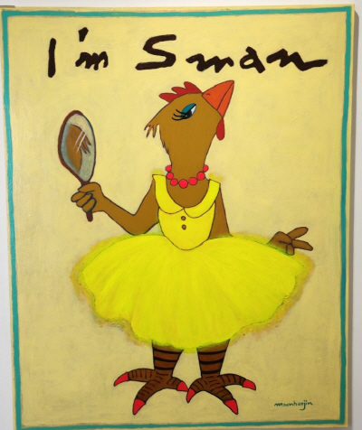 제17회 개인전을 지난 19일 개막, 오는 28일까지 아크갤러리에서 ‘암탉의 비밀’이라는 타이틀로 열고 있는 문희진 작가가 그다. 그의 전시에는 소품 포함 50여점이 내걸렸다. 그의 출품작들은 동화적 상상력이 있는 듯하며 팝아트같기도 하고, 애니적 환상의 세계가 펼쳐져 있다. 그의 작품은 여러 단상들이 뇌리에 박힌다. 우선 그가 구사하는 색상들이 컬러풀하면서도 튀지 않고 자연스럽다. 자칫 천연색의 컬러를 진하게 쓰면 촌스럽게 보이고, 천박하게 보이기까지 하는데 작품들마다 컬러풀한데 싫지 않다. 오히려 어린 시절부터 미술을 해온 사람의 내공이 느끼잔다. 그의 작품들은 하나같이 애 키우는 집에 작품 하나 걸어두면 근사할 것 같다.