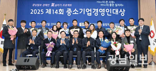 23일 광주 서구 염주체육관 내 올림픽기념국민생활관에서 열린 ‘2025 제14회 중소기업 경영인 대상’ 시상식에 참석한 이승배 광남일보 사장과 고광완 광주시행정부시장, 주순선 전남도 동부지역본부장, 윤일 한국산업단지공단 광주지역본부 혁신팀장, 김우환 광주지방조달청장 등 내빈들과 수상자들