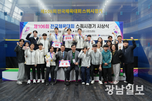 ‘제106회 전국체육대회’ 스쿼시 경기에서 메달을 획득한 광주스쿼시연맹 선수단이 기념 촬영을 하고 있다.
