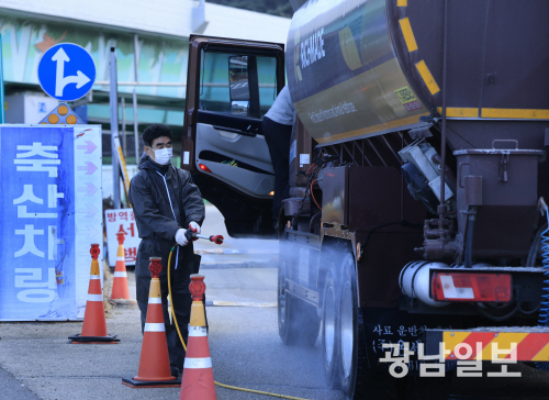 23일 전남 장성 호남고속도로 진입로 입구에 설치된 거점소독시설에서 본격적인 철새 이동에 따른 조류인플루엔자(AI)와 구제역 예방을 위해 방역 관계자들이 사료와 가축차량 소독을 하고 있다.전남 영암 농가와 나주의 한 육용오리 농장에서 고병원성 H5형 조류인플루엔자(AI)가 발생 했다