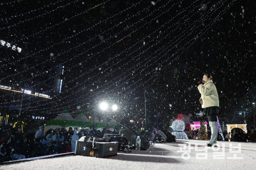 광주 광산구(구청장 박병규 )가 지난 25일 광주송정역 광장에서 시민과 연말의 따뜻함을 나누는 ‘12월 가장 예쁜 역 축제’를 개최했다. 이날 열린 축제에서 하얀 눈과 함께 가수 나비의 공연이 펼쳐 지고 있다. 광주 광산구는 광주송정역 일대를 시민이 머무는 겨울철 대표 명소로 만들기