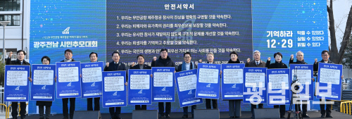 12·29 제주항공 여객기 참사 1주기를 이틀 앞둔 27일 오후 광주 동구 5·18 민주광장에서 열린 1주기 광주·전남 추모대회에서 광주·전남 시·도지사와 국회의원들안전서약서를 서명한 뒤 기념촬영을 하고 있다.
