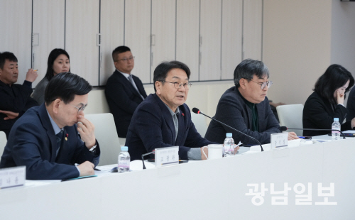 강기정 광주시장이 26일 시청 중회의실에서 열린 복합쇼핑몰 상생발전협의회 킥오프 회의‘에 참석해 회의를 주재하고 있다. 사진제공=광주시