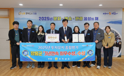 이번 평가는 전남도 22개 시·군을 대상으로 투자유치 실적, 유치 여건 조성, 일반 행정 등의 실적을 평가해 선정했으며, 장흥군은 ‘2023년, 2024년 최우수상’에 이어 3년 연속 수상의 영예를 안았다.