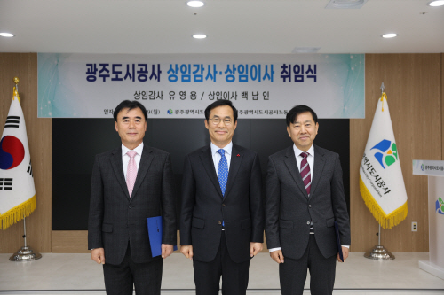 광주도시공사는 유영용 제2대 상임감사와 백남인 제13대 상임이사가 지난 29일 취임했다고 밝혔다. 사진왼쪽부터 유영용 상임감사, 김승남 사장, 백남인 상임이사. 사진제공=광주도시공사