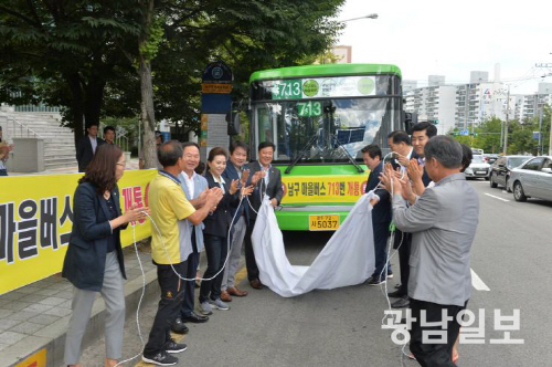 광주 남구는 지난 2018년 7월 남구문화예술회관 앞에서 김병내 남구청장과 마을주민 20여명이 참석한 가운데 ‘남구 마을버스’ 713번 버스 개통 기념식을 열었다.
