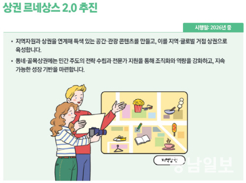 정부는 내년 1분기부터 ‘상권 르네상스 2.0’을 추진해 소규모 골목상권의 성장 기반을 체계적으로 구축할 계획이다. 이에 따라 주무부처인 중소벤처기업부는 내년 1분기부터 ‘상권 르네상스 2.0’을 추진한다. 그동안 개별 점포 중심의 단편적 지원에 머물렀던 골목상권 정책을 내년부터는 공간·관광·콘텐츠·지역 자원을 결합한 종합 성장 전략으로 전환하겠다는 목표다.