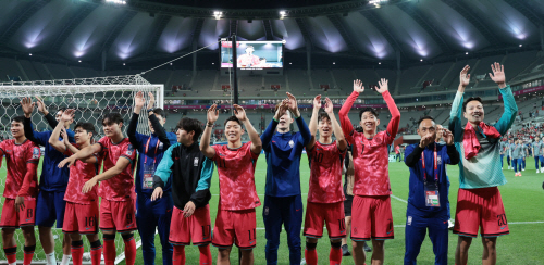 서울월드컵경기장에서 열린 2026 북중미 월드컵 아시아 3차 예선 최종전 한국과 쿠웨이트의 경기. 11회 연속 월드컵 본선 진출에 성공한 한국 선수들이 그라운드를 돌며 팬들에게 인사하고 있다. 연합뉴스