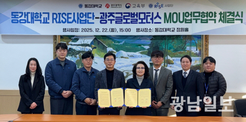 동강대 RISE사업단은 최근 본관 1층 장원홀에서 국내 제1호 상생형일자리 기업인 광주글로벌모터스(GGM)와 지역 산업 발전을 위한 업무협약(MOU)을 맺었다고 4일 밝혔다.