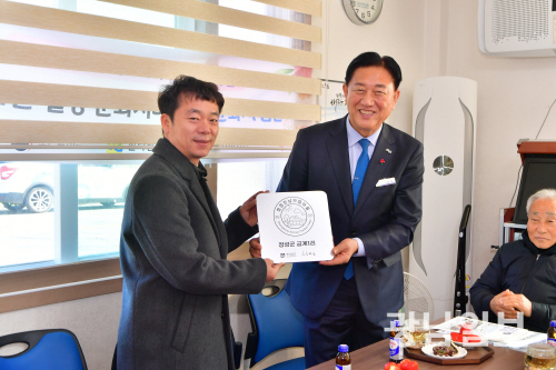 김한종 장성군수가 금계1리 우수 마을 현판을 전달하고 있다.