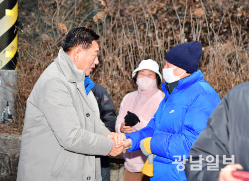 김한종 장성군수가 최근 장성호 제방 해맞이 행사에서 군민들과 새해 인사를 나누고 있다.