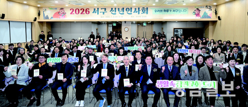 6일 오후 광주 서구청 들불홀에서 열린 ‘2026 서구 신년 인사회’에 참석한 김이강 서구청장과 유관기관장, 사회·지역단체장, 주민들이 파이팅을 외치며 기념촬영을 하고 있다.광주 서구는 기존의 내빈 중심 행사에서 벗어나 주민들이 무대에 올라 ‘서구를 바꾸는 시간 15분’을 통해 서구의 변화를 직접 전하고 공유하는 방식으로 ‘신년 인사회’를 개최했다. 최기남 기자 bluesky@gwangnam.co.kr