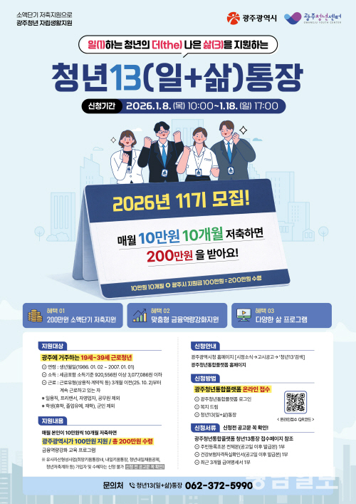 광주시는 10만원씩 10개월 저축하면, 100만원을 더 받는 ‘청년13(일+삶) 통장’ 사업을 추진한다고 7일 밝혔다.