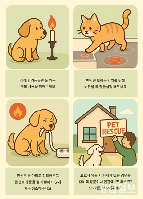 소방서는 반려동물로 인한 화재는 주로 동물이 전기레인지. 인덕션 등의 전원 버튼을 건드리거나 전선을 물어뜯어 합선. 단선 등으로 발생하는 경우가 많아 보호자가 외출할 시 반려동물이 주방이나 거실을 자유롭게 들락거리지 못하도록 특별한 관리가 필요하다고 덧붙였다.