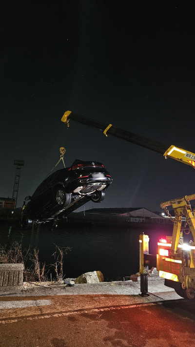 7일 광양항 해양공원 인근 해상에 추락한 차량을 육상으로 인양하고 있다. 사진제공=여수해양경찰
