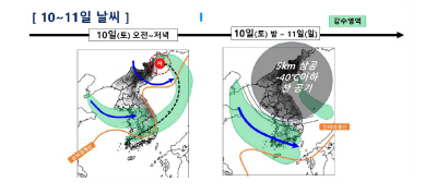 이번 눈은 11일 오후까지 이어질 것으로 보인다. 해기차로 형성된 구름대와 상층의 찬 공기 영향이 겹치면서 일부 지역에서는 대설경보 수준의 많은 눈이 내릴 가능성도 있다.