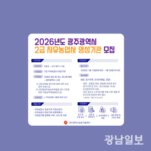 광주시 농업기술센터는 12일부터 30일까지 ‘2급 치유농업사 양성기관’ 지정을 위한 신청을 받는다.