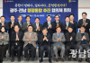 12일 오후 전남 나주 동신대학교 전남연구원에서 열린 광주·전남 통합 행정협의체 회의에서 강기정 광주시장과 김영록전남도지사가 참석자들이 기념촬영 하고 있다.최기남 기자 bluesky@gwangnam.co.kr