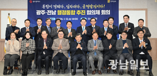 12일 오후 전남 나주 동신대학교 대정1관 전남연구원에서 열린 광주·전남 통합 행정협의체 회의에서 강기정 광주시장과 김영록 전남도지사가 협의체 위원들과 기념촬영 하고 있다.최기남 기자 bluesky@gwangnam.co.kr