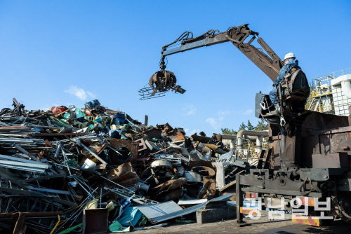 수거된 스크랩을 스크랩 야드에서 정리작업을 하고 있다.