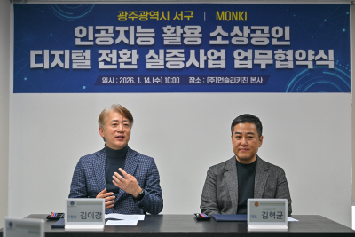 광주 서구는 14일 서울 강남구 ㈜먼슬리키친 본사에서 ‘인공지능 활용 소상공인 디지털 전환 실증사업 추진을 위한 업무협약’을 체결했다.(사진 왼쪽부터 김이강 광주 서구청장, 김혁균 ㈜먼슬리키친 대표)