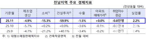 전남의 실물경제는 제조업 생산이 제1차금속(-10.8%), 화학물질 및 화학제품(-2.7%) 등의 영향으로 전년 동월 대비 4.9% 감소했다.
