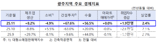 광주의 제조업 생산과 수출 등이 증가한 가운데 소비는 감소했다. 전남은 제조업 생산과 소비, 건설투자, 수출 모두 부진에서 벗어나지 못했다.