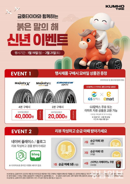 금호타이어 한국영업담당 김성 상무는 “2026년 새해를 맞아 그동안 금호타이어를 신뢰해 주신 고객 여러분께 감사의 마음을 전하고자 이번 이벤트를 마련했다”며 “금호타이어 프리미엄 타이어를 통해 보다 안전하고 쾌적한 주행 경험을 제공하는 것은 물론, 다양한 혜택으로 고객 만족을 더욱 높여 나가겠다”고 말했다.