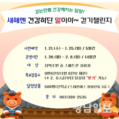 담양군은 2026년 새해를 맞아 오는 26일부터 2월 8일까지 온라인 걷기 챌린지 ‘새해엔 건강하단 말이야’를 운영한다고 밝혔다.