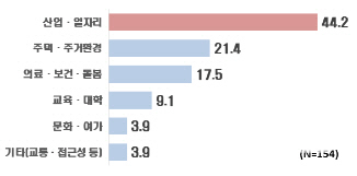 지역 인프라에 대한 평가에서도 ‘산업·일자리’ 항목이 2.1점(5점 만점)으로 최저 점수를 기록했다. 이외에도 ‘교육·대학’(2.2점), ‘문화·여가’(2.45점), ‘의료·보건·돌봄’(2.54점) 등의 점수가 낮았다.