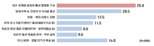 응답 지자체 25.0%는 ‘귀촌 연계형 일자리 매칭 플랫폼 구축(25.0%)’을 ‘3자 연합’ 모델 성공을 위한 최우선 정책과제로 꼽았다. 이어 안정적 주거시설 제공(20.5%), 의료·복지 서비스 강화(12.5%), 지역 중소기업 인센티브 제공(채용보조금 등)(11.5%) 등 순이었다.