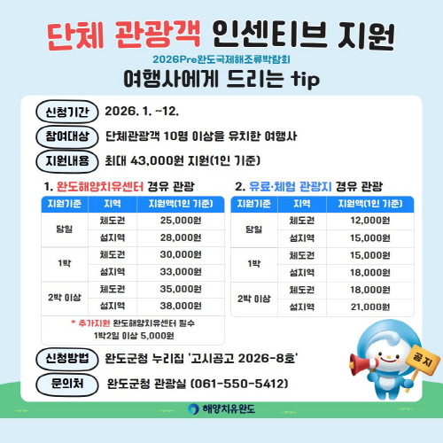 지원 기준은 내·외국인 단체 관광객 10명 이상 유치 시 당일 기준 체도(육지)권은 1인당 1만2000원, 섬 지역은 1만5000원이 지원된다.