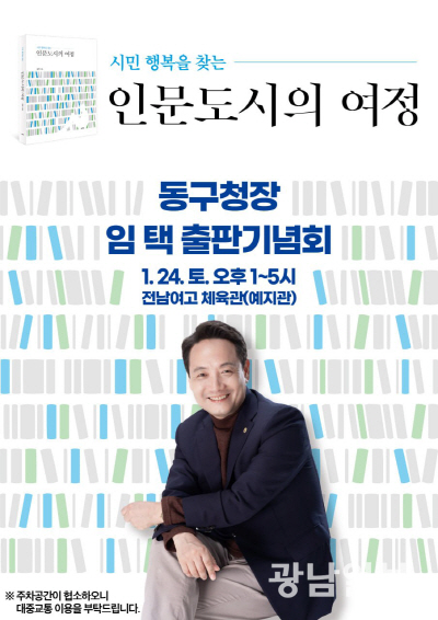 임택 광주 동구청장은 오는 24일 오후 1시부터 5시까지 전남여고 체육관(예지관)에서 사람 중심 인문도시 정책 추진 경험을 담은 저서 ‘인문도시의 여정’의 출판기념회를 개최한다.