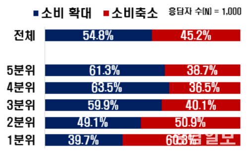 소득 분위별로 보면 하위 40%(1∼2분위)는 올해 소비를 줄일 것이라는 응답이, 상위 60%(3∼5분위)는 소비를 늘릴 것이라는 응답이 다수를 차지했다.
